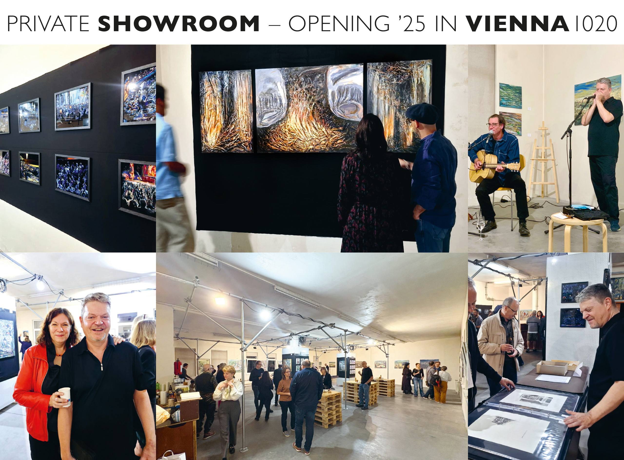 Seit Oktober 2025 darf ich eine Auswahl meiner Arbeiten in einem über 200 m² großen Showroom in Wien präsentieren. Zu sehen sind mehr als 80 Malereien und Grafiken, viele davon aus den vergangenen zwei Jahren. Die temporär adaptierten Fabrikräume bieten mir die Möglichkeit, meine drei zentralen künstlerischen Arbeitsfelder zu zeigen: Druckgrafik, Öl- und Hinterglasmalerei.